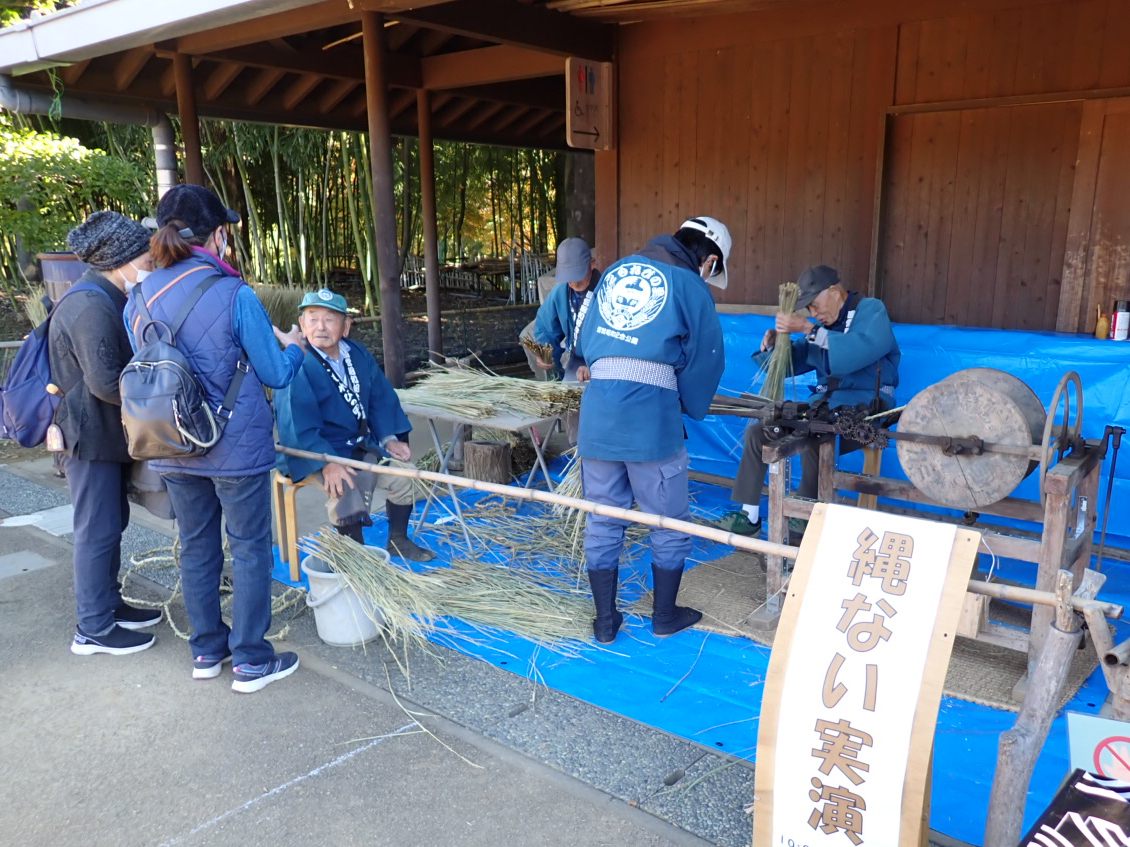 里の小屋の下屋で、「縄ない実演」を行いました。「縄ない機」を使って稲わらを縄にしていきます。