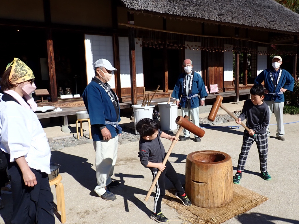 農家の庭で、杵(きね)と臼(うす)を使って「餅つき体験イベント」を行いました。