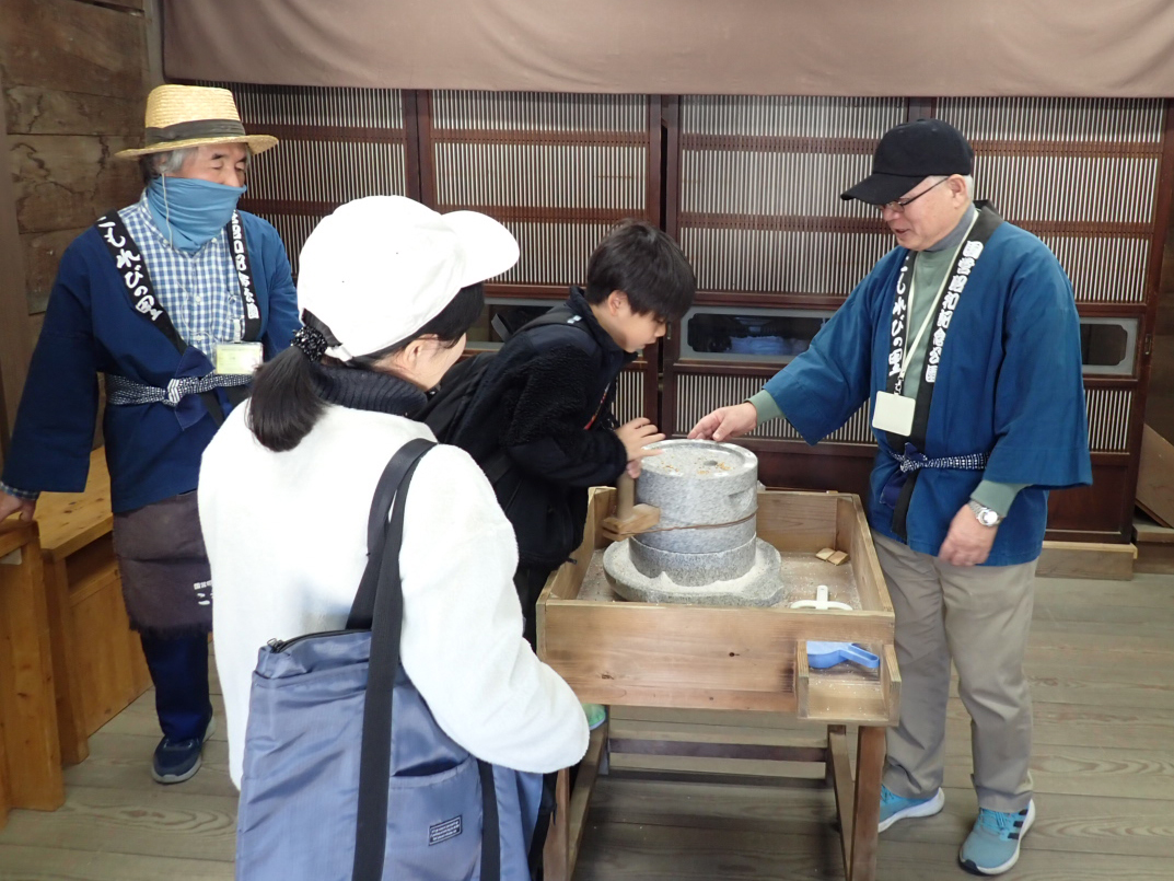 農家の外蔵で、石臼(いしうす)を使い小麦を粉にする「粉引き体験」を行いました。