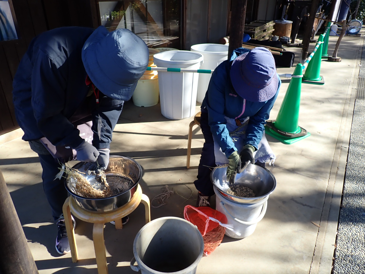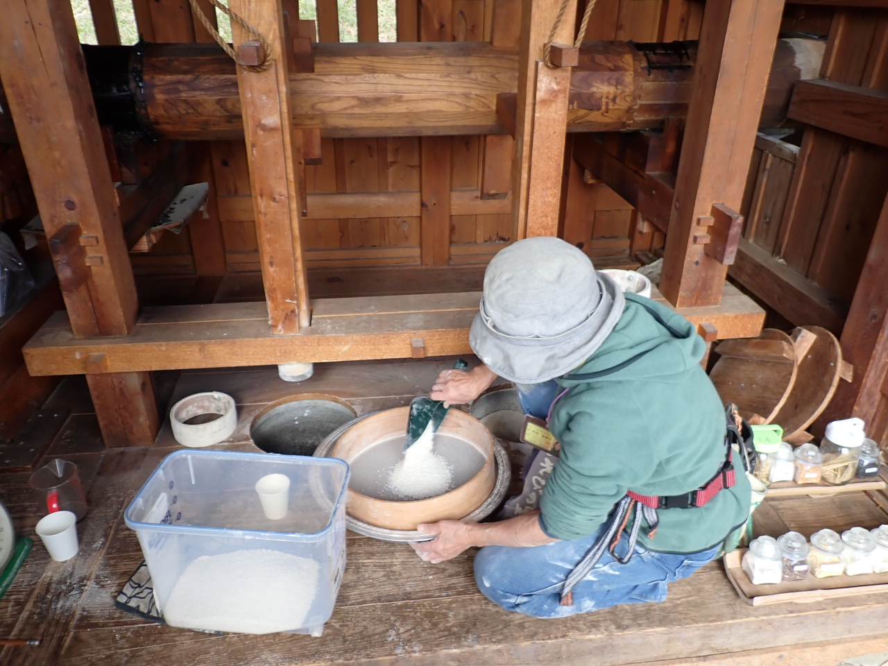 水車小屋で搗いた米の糠を取り除きました。