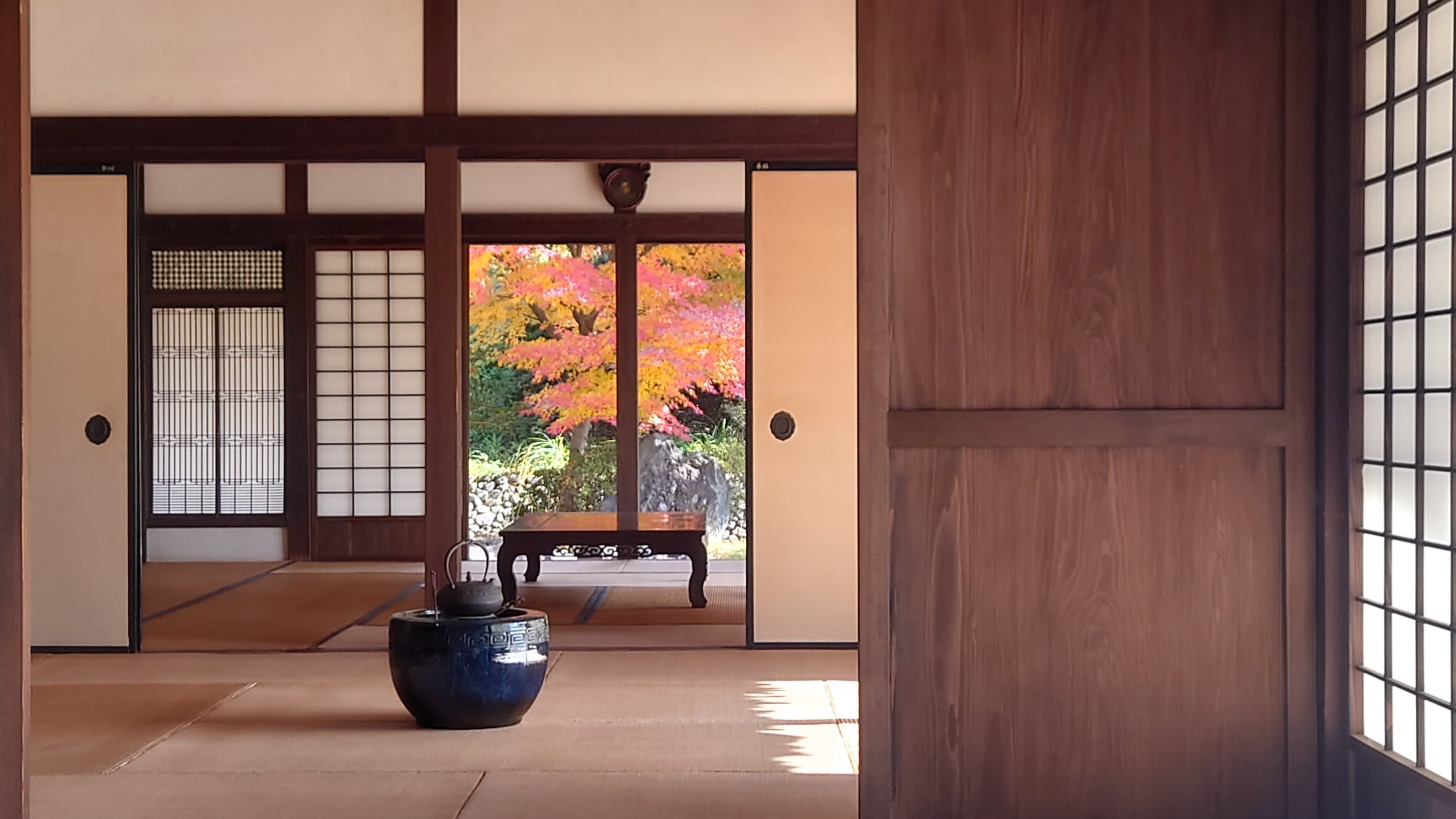 農家の土間から見える紅葉が色づき始めました。