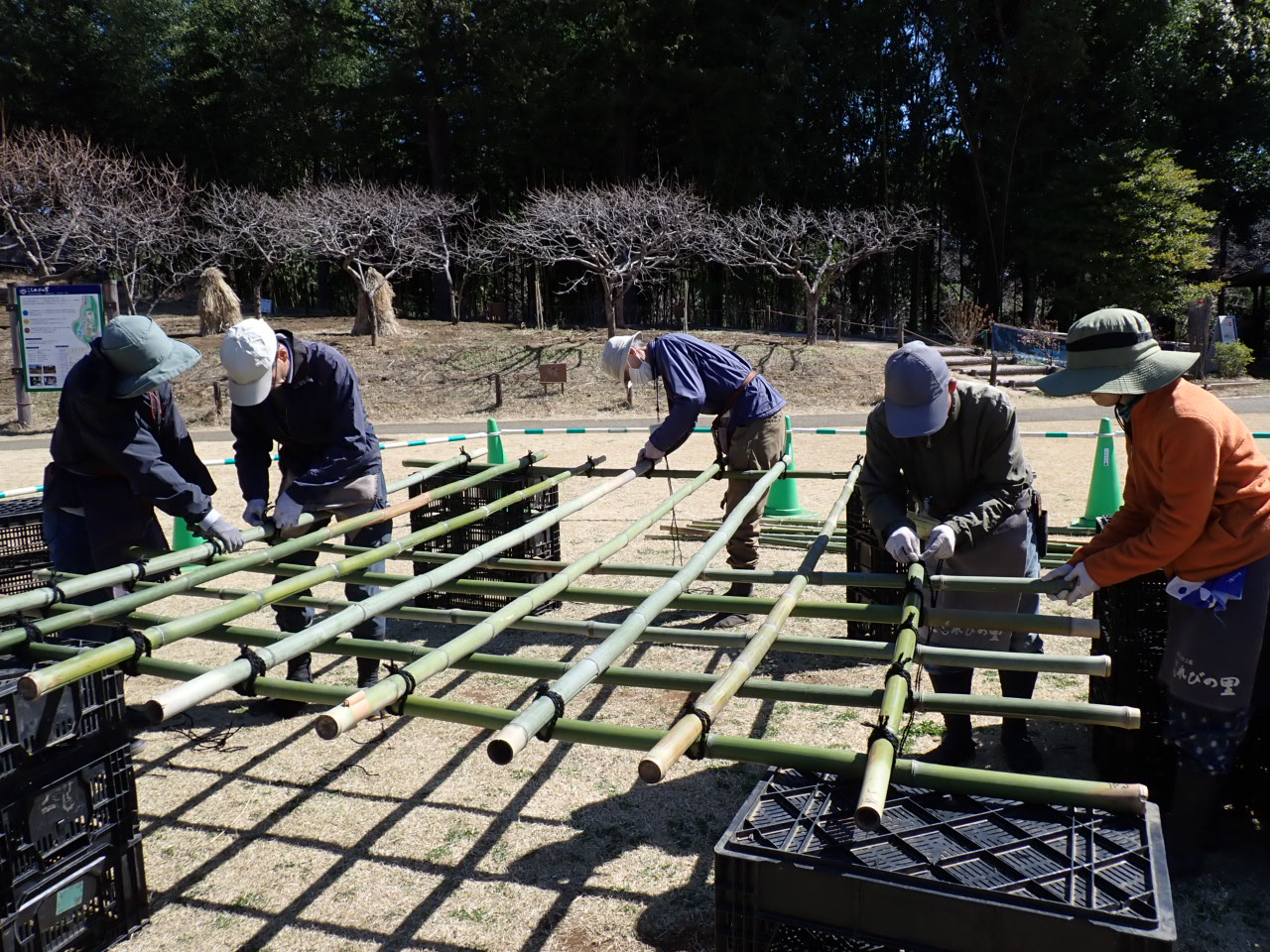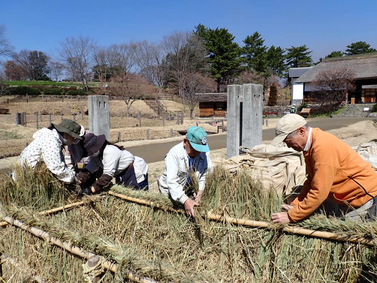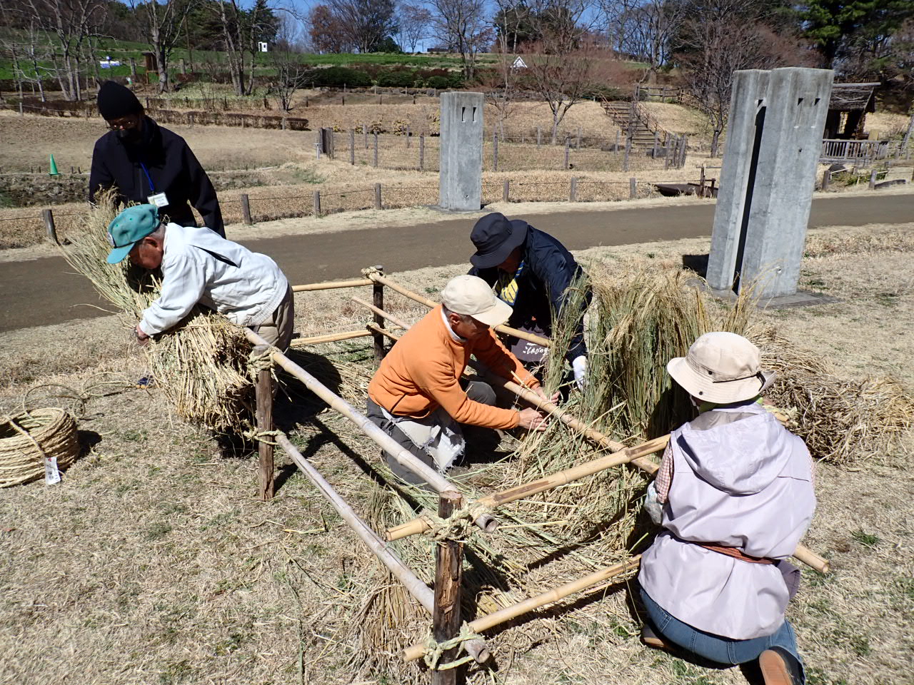 「サツマイモの苗床」作りをしました。竹で枠を作り、外側を稲わらで囲い編み込みます。