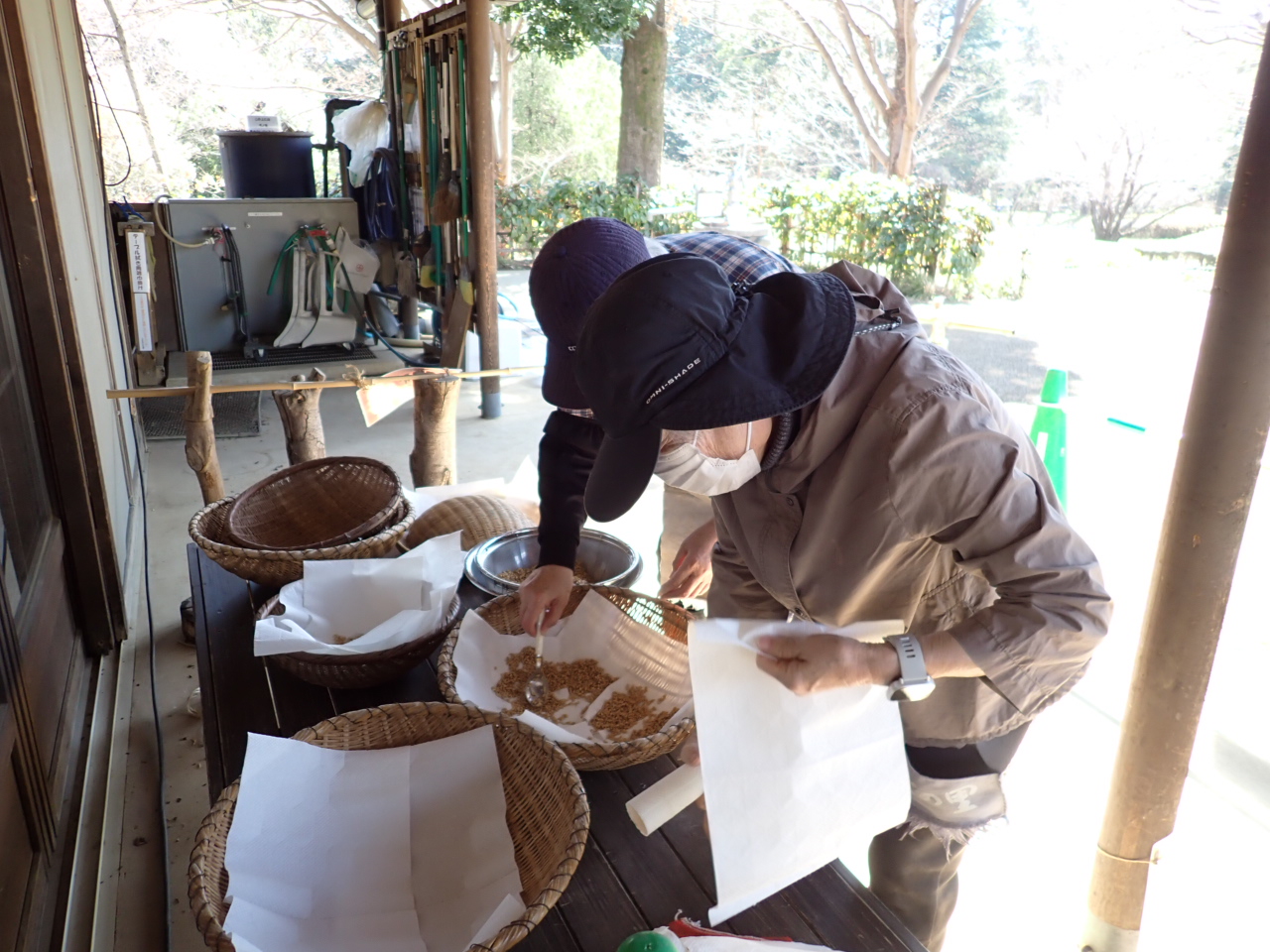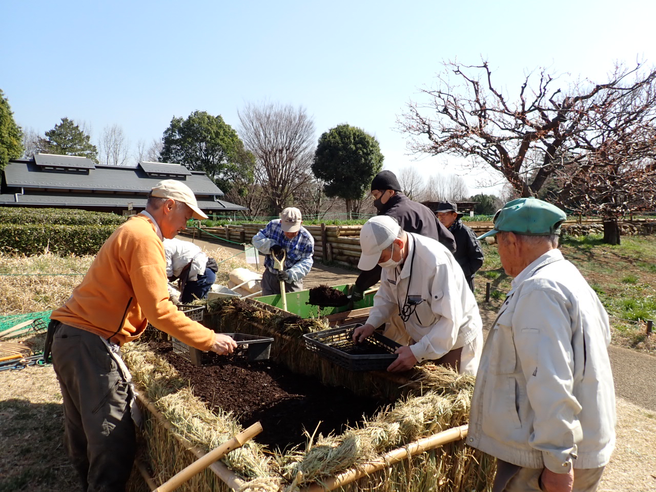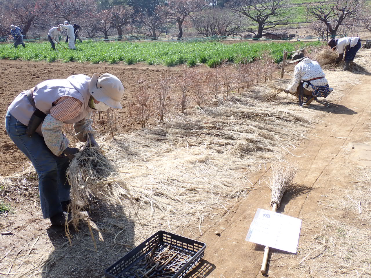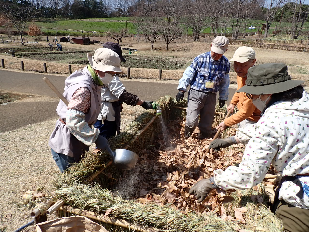 「サツマイモの苗床」作りをしました。竹で枠を作り、外側を稲わらで囲い編み込みます。