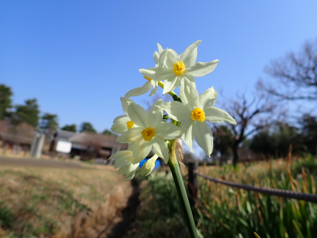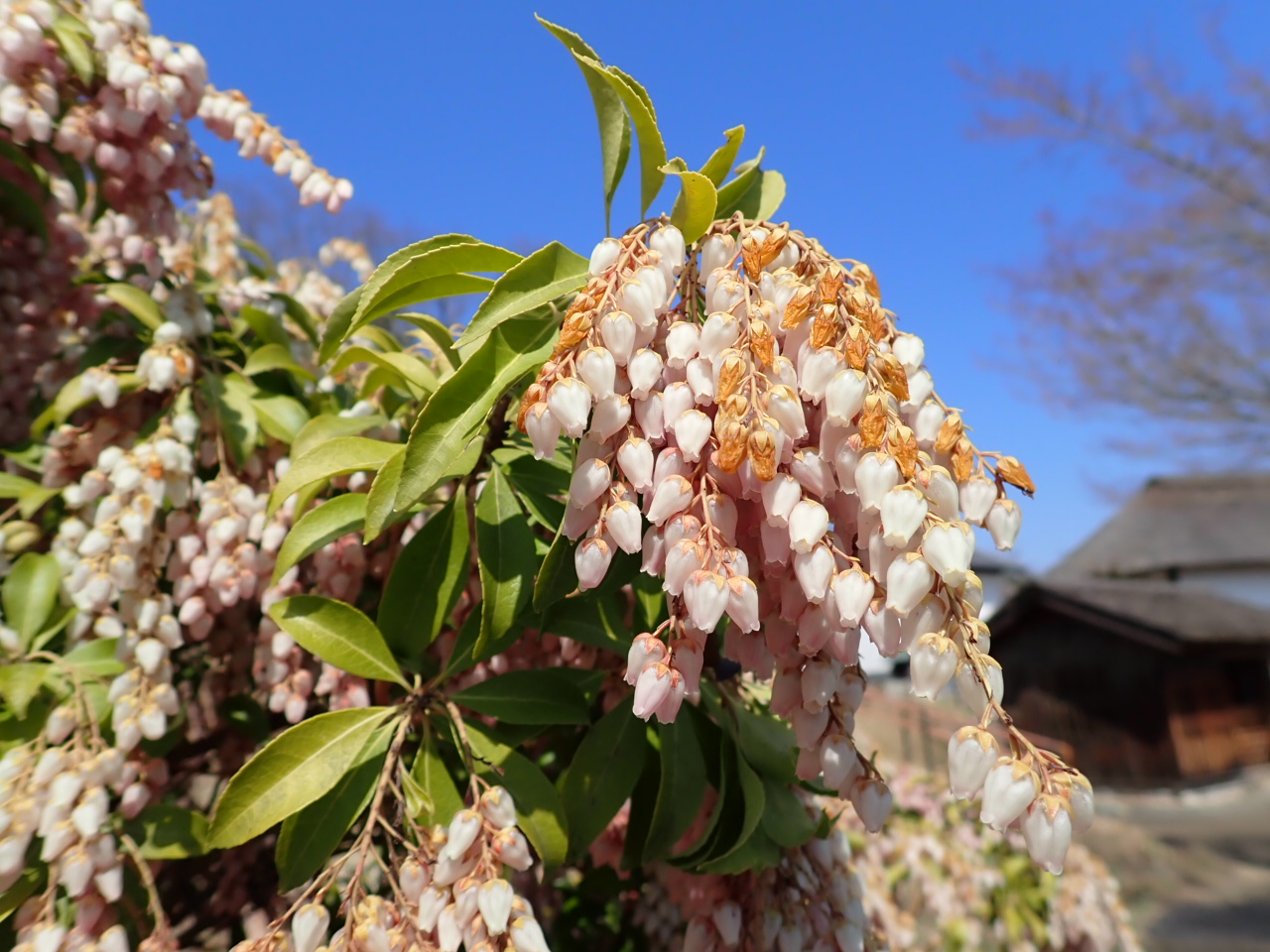 こもれびの里内」に、スイセンとアセビが咲いています。