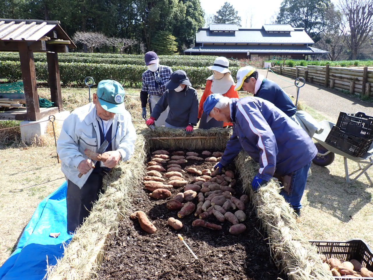 保存していたサツマイモの種イモを掘り出し、先週作った「サツマイモ苗床」に伏せ込みました。芽が出るまで、毎日温度管理をします。